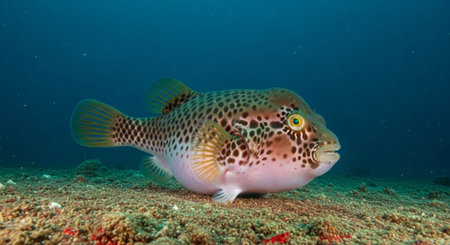 Yellow with brown spots puffer fish floats on coral bottom of sea