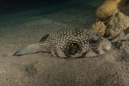 White-spotted puffer in the sea. The wonderful world of the Red Sea. Sea Scenery Travel photo Top view Close up