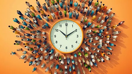 A bustling urban street filled with people, showcasing multiple clocks that highlight the rhythm of city life. The scene captures the dynamic energy of modern living.