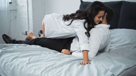 cheerful woman in white shirt hugging boyfriend in formal wear on bed at home