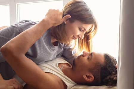 Portrait of a multiracial couple, boyfriend and girlfriend face to face, lie near the window