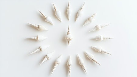Beautiful arrangement of white seashells on a light background, creating a minimalistic and tranquil design. Perfect for beach or nature-themed projects.