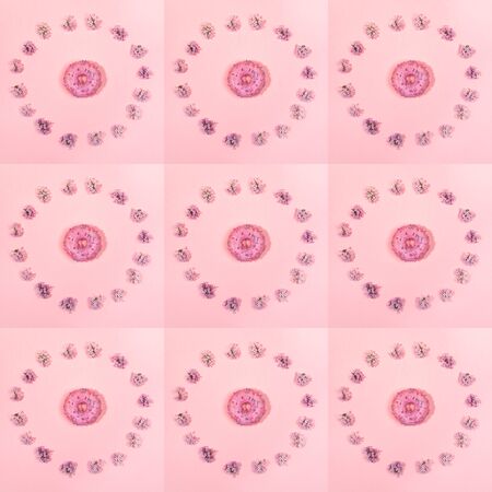 Creative floral spring pattern of several square layouts with flowers of lilac laid out in circle around traditional doughnut on trendy pink backdrop. Top view, flat lay.