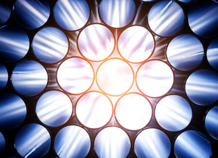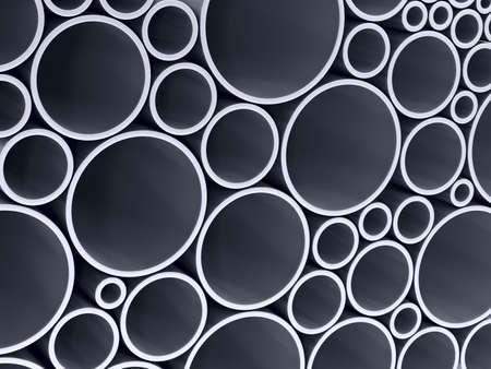 Background of grey plastic sewage pipes used at the building site. Texture and pattern of plastic drainage pipe. Light through tubes.