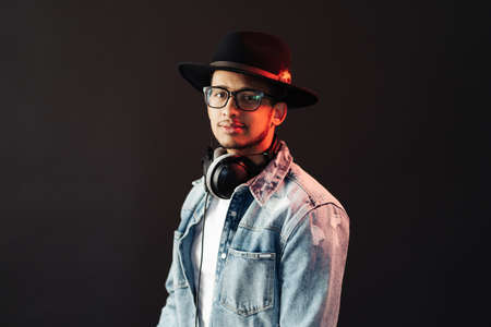 Young African American man portrait wearing headphones and hat and enjoy music over black Background