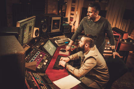 Sound engineer and musicians working in boutique recording studio.
