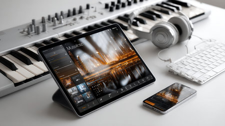 A tablet and two phones sit on a table next to a keyboard and a pair of headphones. The tablet is displaying a cityscape, and the phones are both turned on. Scene is one of productivity and focus
