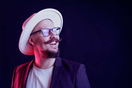 Handsome stylish beard man in white wide-brimmed hat in blazer in glasses is smiling. color filters