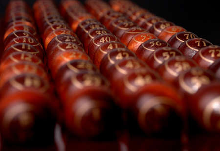 Lotto game. Wooden lotto barrels background. close up. top view