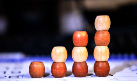 Small wooden barrels with numbers built in columns. The concept of progressive movement in achieving the goal. Sequence of actions to obtain the effect and result