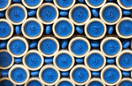 A closeup shot of blue barrels in the factory