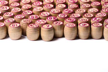 A lot of barrels from the lotto on a white background. Barrels are wooden with red numerals. Among the wooden barrels stands out with the number 13.