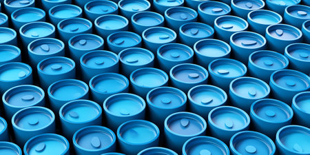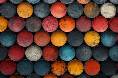 A conceptual photograph featuring chemical drums arranged in a visually appealing pattern, emphasizing their shapes and colors. --ar 3:2 --v 6 Job ID: d770404b-86a3-496f-8271-f498e9b0330f