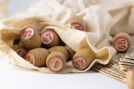 Cards and kegs for Russian lotto (bingo game) Old lotto barrels in a canvas bag