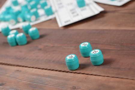 Many barrels with numbers and cards for lotto or russian bingo table game on wooden surface. Russian lotto has similar rules to classical worldwide bingo game