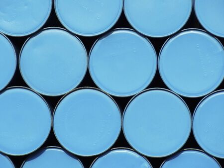 A close-up of petroleum oil barrels stacked, with ample space above for copy