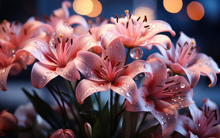 Festive floral background with wet pink lilies close up. Waterdrops on delicate pink petals - symbol of purity, harmony, freshness and love. Greeting card for any holidays or festive events