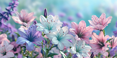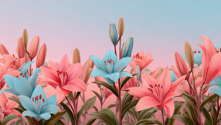 This image showcases an array of colorful lilies with delicate petals and stems. The composition features a variety of shades including pink, blue, and orange against a soft gradient backdrop. The style suggests an illustrative approach, suitable for decorative use, design projects, or editorial content.
