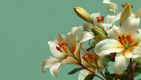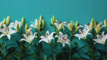 This image features several white lilies with prominent yellow and orange details, set against a solid turquoise backdrop. The floral composition utilizes a soft, natural lighting style. It may be suitable for various uses, including marketing materials, or decorative design. The image emphasizes the natural beauty of the flowers.