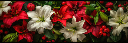 Beautiful lily flowers with green leaves and red berries. Floral background.