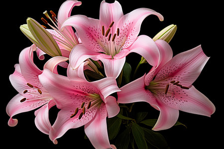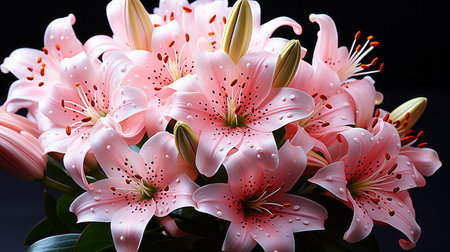 A cluster of white lilies is beautifully arranged, highlighting intricate patterns on petals. The dark background enhances their elegance and vibrancy, creating a striking composition. Generative AI.