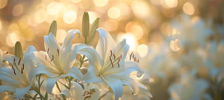 Elegant White Lily Flowers With Orange Pistil With Sparkly Bokeh Background and Copy Space