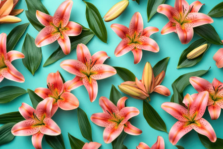 Pattern of Orange Lily Flowers on a Turquoise Background. Floral Design, Flat Lay, Top View