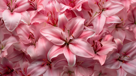Beautiful pink lily flowers as background, top view. Floral pattern