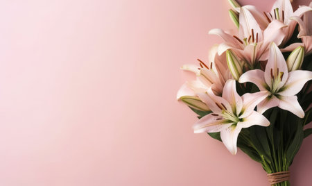 Spring flowers lily. Bouquet of flowers on pastel background. Valentine's Day, Easter, Birthday, Happy Women's Day, Mother's Day. Flat lay, top view, copy space for text