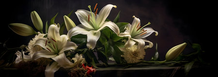 AI Generated. Elegant White Lily Bouquet Over Dark Backdrop with Copy Space