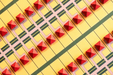 Abstract model of a village or city district. The project of a new neighborhood or a DIY game. Homemade houses with red roofs made of paper. Selective focus, blurred background. View from above. Close-up, macro.