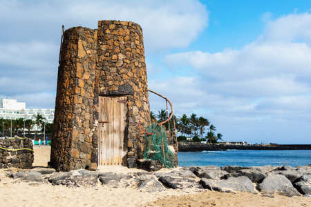 Stone tower in Las Cucharas beach, Lanzarote, Canary islands. VIew of the sea, sandy beach and rocks