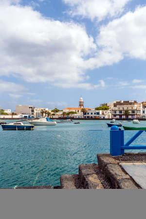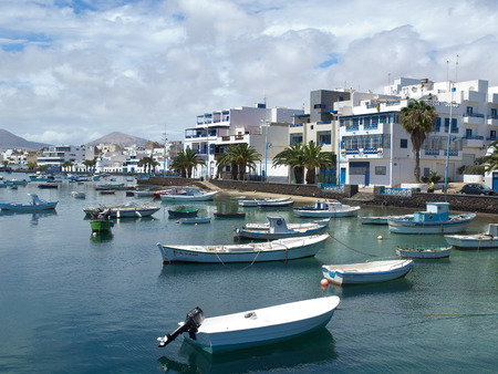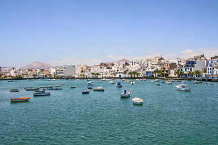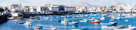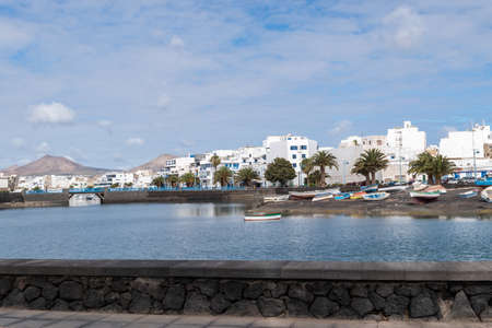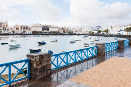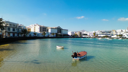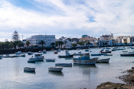 View of El Charco de San Gines - marina in Arrecife City and fishing boats in it. Sailing, tourism and nature concept.