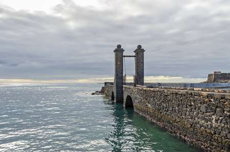 Bridge with Castle Doors (Puente de Las Bolas) of the Castle of Saint Gabriel (Castillo de San Gabriel) on a small island in Atlantic in front of Arrecife, the capital of Lanzarote island in Spain.