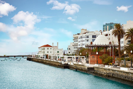 Beautiful quay with historic architecture and boats on blue water in Arrecife, Lanzarote, Canary Islands, Spain