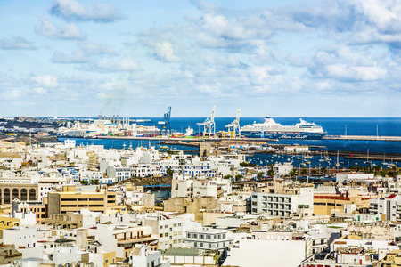 ARRECIFE, SPAIN - JAN 1, 2010: aerial of Arrecife with cargo and cruise ship harbor. The new harbor was built in 2004 and offers piers for Cruise ships.