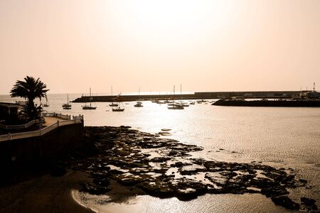 Panoramic view during sunset on the harbour of Los Cristianos, Tenerife, Spain, Europe. Water reflection in the shoreline full of small rocks. Ferry to La Gomera waiting in harbor. Summer vacation