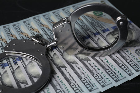 Corruption. Handcuffs and dollar banknotes on black table, closeup