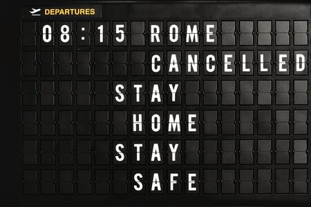 Cancelled delay flight airplane at Information board flight timetable. Airport terminal display for passenger departure and arrival.