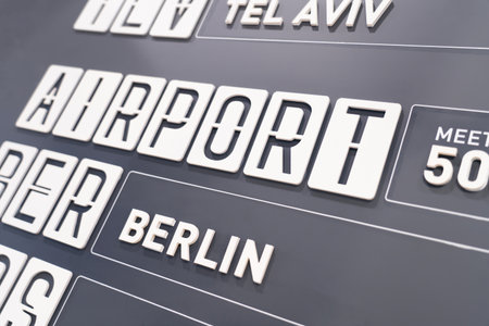 Close-up image showing Berlin flight status on grey wall of airport.