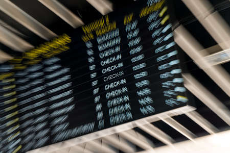 Zoom effect departures check in board at an airport