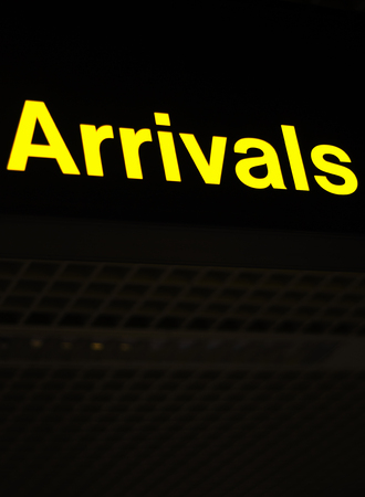 Airport information sign light panel giving directions for arrivals lounge for air travelllers.