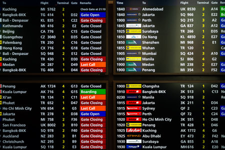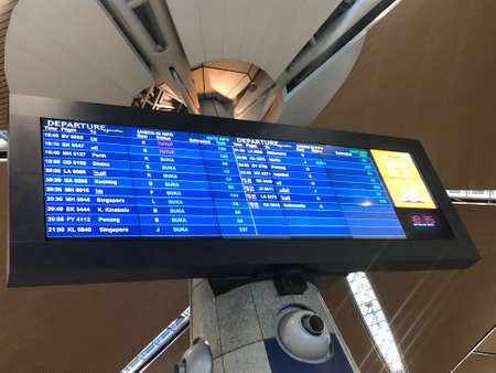 Kuala Lumpur, Malaysia - 1 December, 2015: Departure boards listing flight numbers, gates and times at Kuala Lumpur International Airport.
