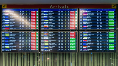 Changi Airport, Singapore - May 8, 2024: Large Arrivals Board in Singapore Changi International airport viewed from the terminal corridor