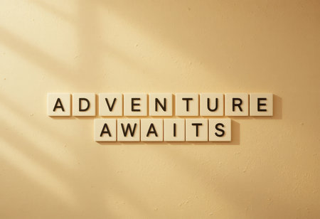 A captivating arrangement of letter tiles spelling 'Adventure Awaits' against a softly lit wall, inspiring exploration and positivity in any space.