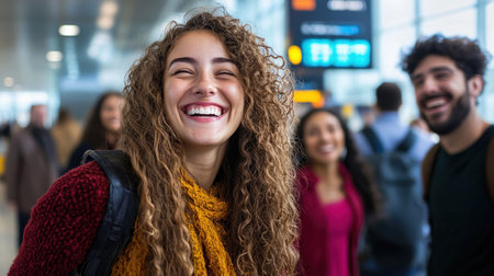 A young woman with a backpack smiles while walking through a busy airport terminal with many travelers