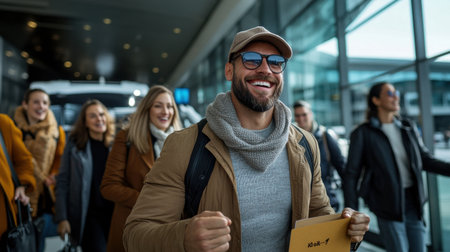 A group of happy travelers walking down the stairs of an airplane
