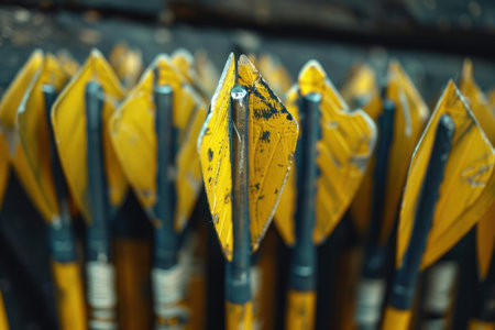 Close up of yellow fletchings on a group of arrows for archery target practice