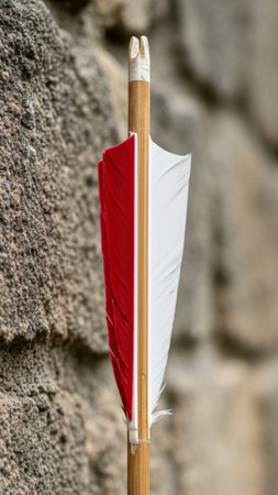 Single wooden arrow with red and white feather fletching leaning against a weathered stone wall in a