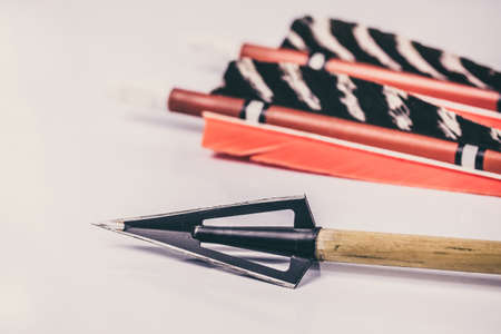 The front arrow heads of standard compound archery bow arrows. Shallow Depth of field